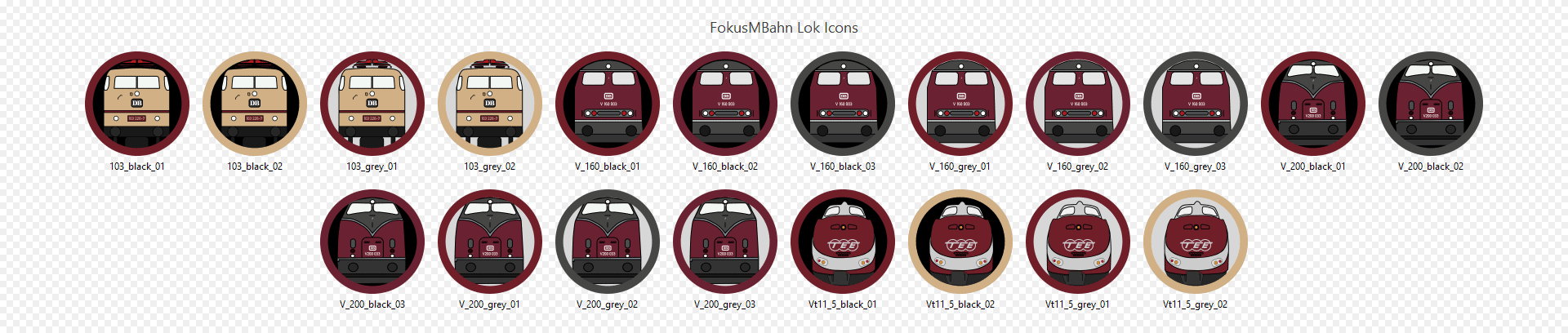 20 Icons, von 4 Fahrzeugen der DB, darunter die legendäre BR 103 und der TEE Triebzug 11.5. Die Incons sind so genannte Prototypen, ich wollte einfach mal ausprobieren, wie die gezeichneten Icons aussehen. Die Incons sind kompatibel mit Windows und MacOS, PNG Filed inkludiert. Frei zur persönlichen Verwendung.